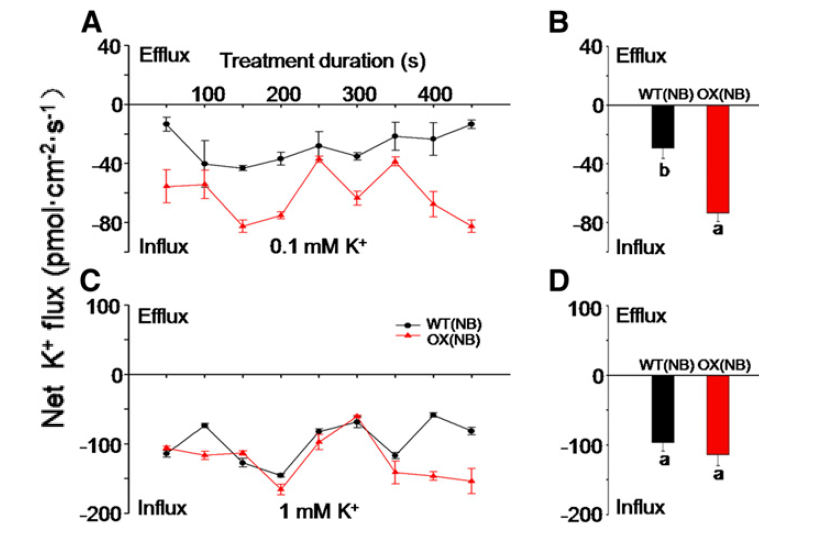 ??????? KT/HAK/KUP 是植物中最大的K 轉(zhuǎn)運(yùn)家族,但其家族中大多數(shù)成員的生理功能并未被深入研究。本研究以這一家族中的 OsHAK5 為研究對象,檢測其在細(xì)胞以及組織上的定位,分析其功能。通過非損傷微測技術(shù)(NMT)研究發(fā)現(xiàn),OsHAK5 提升了水稻根部K+的內(nèi)流速率,促進(jìn)了K+由根部向地上部分的運(yùn)輸。